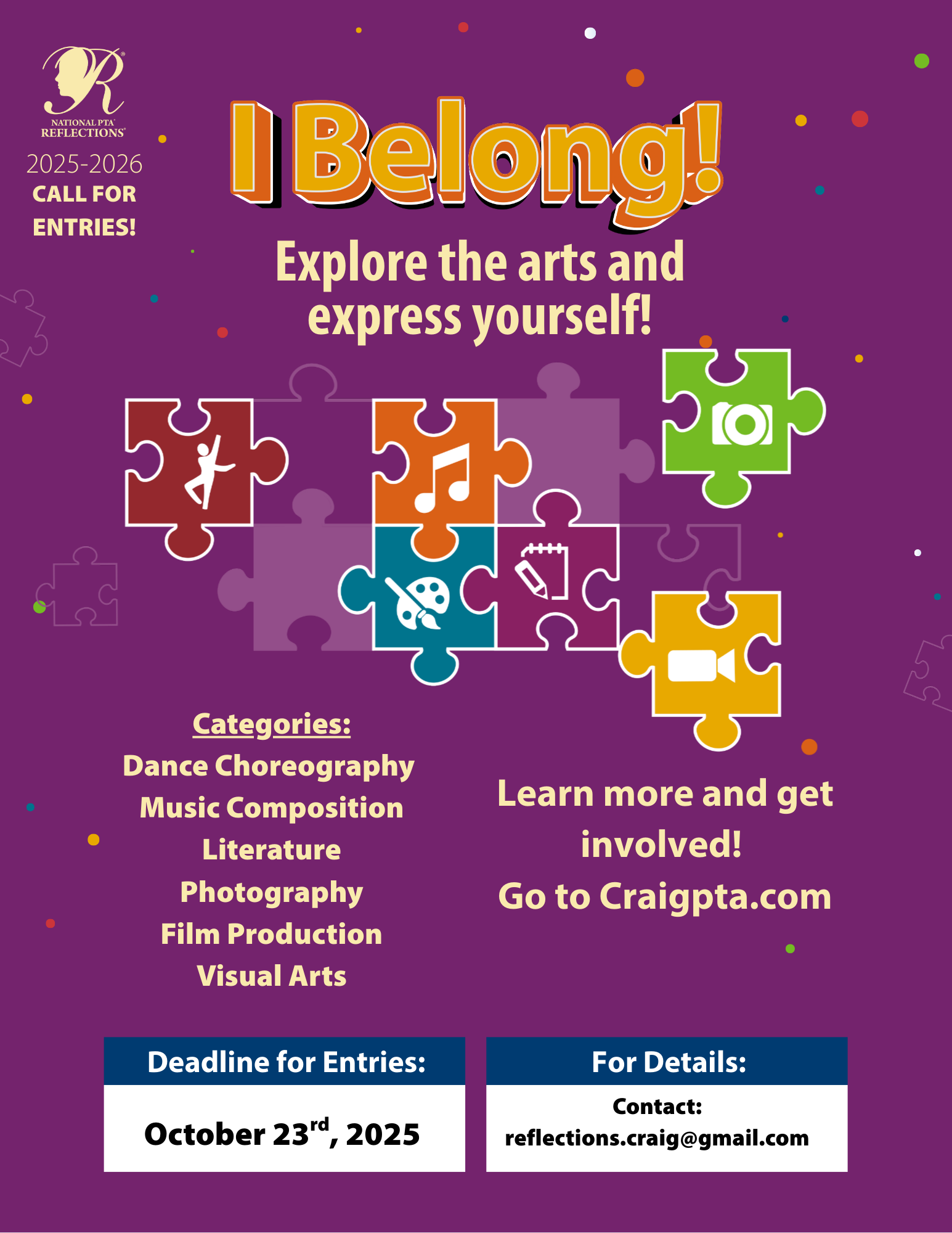 The 2025-2026 PTA Reflections theme, “I Belong,” invites students to explore what it means to feel accepted, valued, and connected. This theme emphasizes the importance of inclusion and belonging; whether within families, schools, friend groups, or communities. Through art forms such as Dance Choreography, Music Composition, Literature, Photography, Film Production, and Visual Arts, students can express personal stories of finding their place, building connections, and celebrating diversity. It’s an opportunity for young artists to reflect on the people, places, and experiences that make them feel seen and supported. Families can join in celebrating the power of belonging, reminding every child that they are an essential part of something greater.
